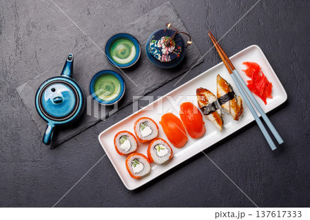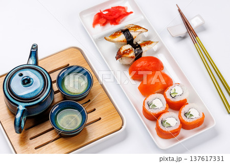 Eel sushi set with tea and teapot