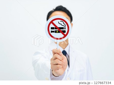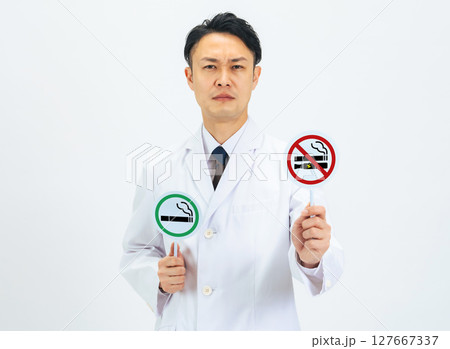 禁煙マークを持つ男性医師