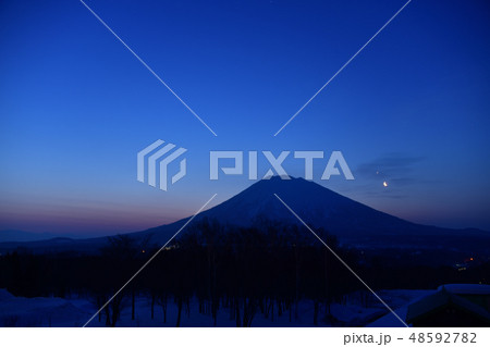 早春の北海道ニセコ町から羊蹄山(蝦夷富士)の稜線から三日月と明けの明星が昇る夜明けの風景を撮影