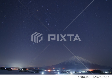 北海道倶知安町瑞穂から望む羊蹄山とオリオン座と冬の大三角
