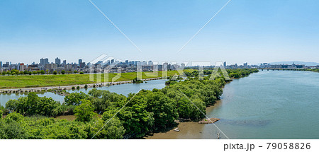 パノラマ 淀川菅原城北大橋城北側から大阪市内中心部
