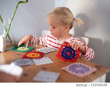 4 year old girl sitting at the table arranging knitted squares. autistic play