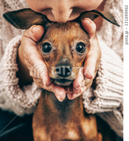 Closeup of woman kissing her beloved dog, owner holding tiny puppy face, concept of unconditional love and deep connection between human and animal