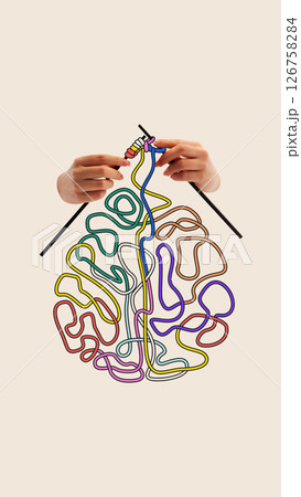 Ideas in Progress. Hands knit colorful tangled threads into brain, showing how bright thoughts form gradually from inner chaos. Conceptual art collage