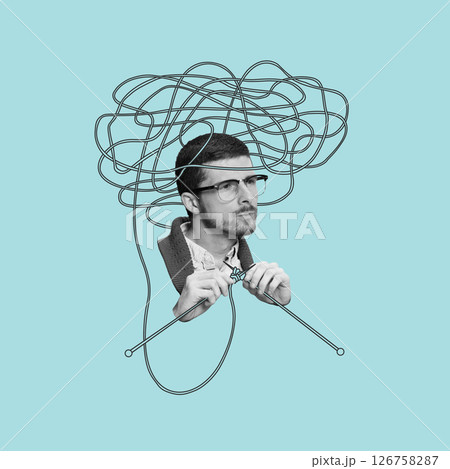 Thread of Thought. Man knits red yarn into brain above, showing how thinking forms slowly and mindfully. Conceptual art collage