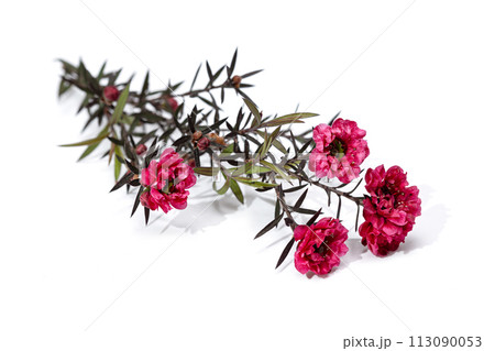 Leptospermum scoparium twig with bloomed pink flowers isolated on white background