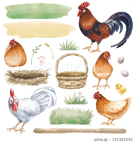 A set of poultry, chickens, lawns, eggs and a basket with a nest on an isolated background.. Watercolor illustration of a poultry yard. Realistic clipart for the design of farm products and rural