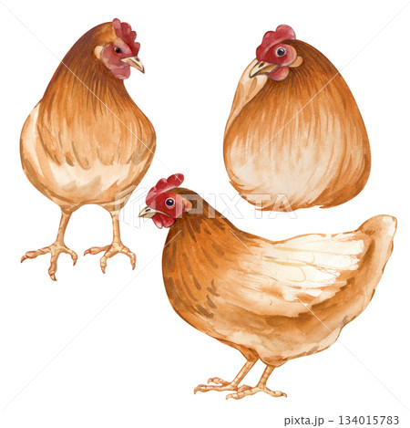 A set of several brown and orange hens. Watercolor illustration on an isolated background. Poultry yard, sitting and standing birds for farm and countryside designs in natural colors. Vintage