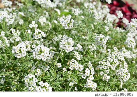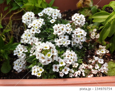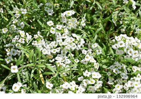 白い花を咲かせるアリッサム(スイートアリッサム、ニワナズナ、ニオイナズナ)