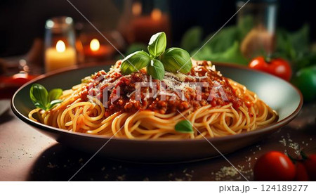 Delicious spaghetti with rich tomato sauce and basil garnish. Watercolor clipart