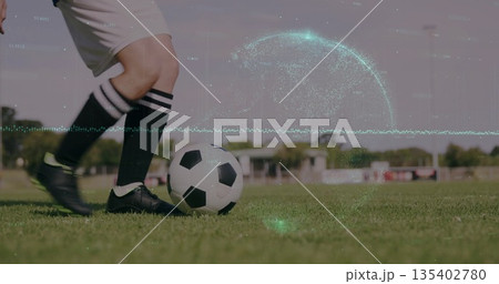 Dribbling female player controlling ball on grass field in neon cleats, with green digital overlay