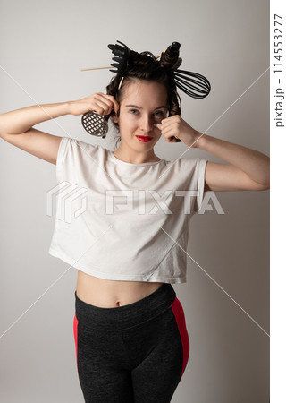 beautiful brunette housewife girl with kitchen utensils in her hair instead of curlers