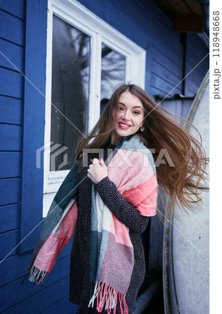 portrait of a young woman with long blond hair in a light dress in winter by blue barn