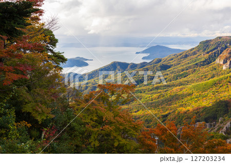 秋の北海道 紅葉の大沼公園 夕暮れの小沼
