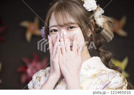 振袖を着た女性のネイルされた手、成人振袖イメージ