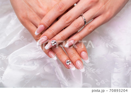 写真素材:結婚指輪をはめた花嫁の手、指、手、モデル、女性、結婚、ドレス、水色