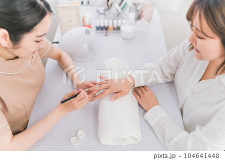 ネイルサロンでベースコートを塗るネイリストと女性