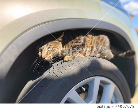 車のタイヤハウスに潜り込むキジトラ猫