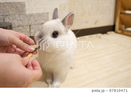 餌をもらうネザーランド・ドワーフ(うさぎカフェ)