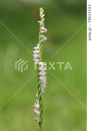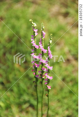 芝生の中で咲くネジレ花 緑背景のピンクのネジレ花