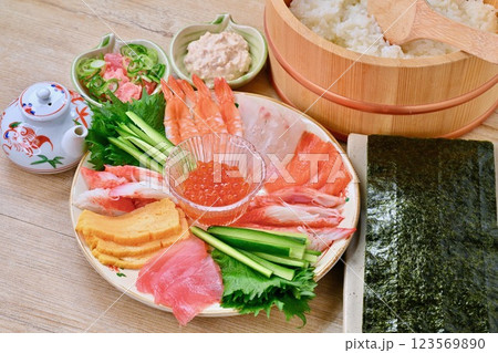 手巻き寿司のイメージ。イクラ、エビ、マグロ、サーモン、ツナマヨなど。