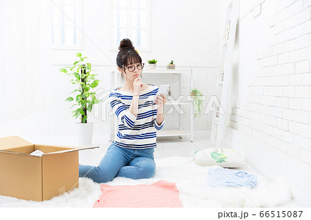 使わなくなった服をネットで売る準備をする女性