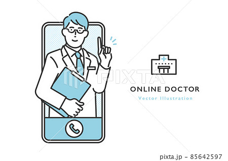 スマートフォンでオンライン診療する、男性医師(線画カラー)のイラスト