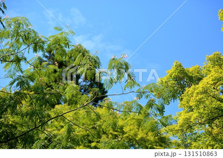 青空に広がるネムノキの緑葉と夏の爽やかな風景