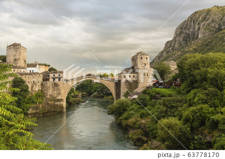 南欧ボスニアヘルツェゴビナのモスタル ネレトヴァ川に架かる世界文化遺産の橋スタリモスト