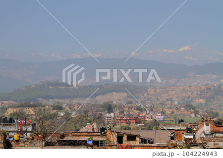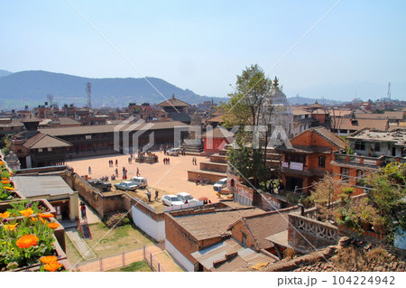 南アジアのネパール首都カトマンドゥ郊外の世界文化遺産の古都バクタプル 一画の屋上展望台からの景色
