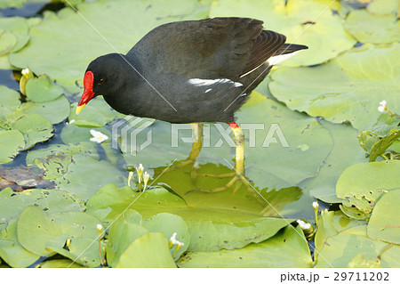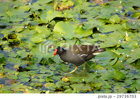 公園濕地沼澤裡覓食的紅冠水雞亞種成鳥