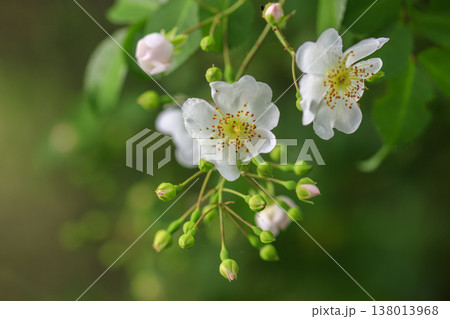 新緑の森に咲く雨に濡れた白いノイバラの花