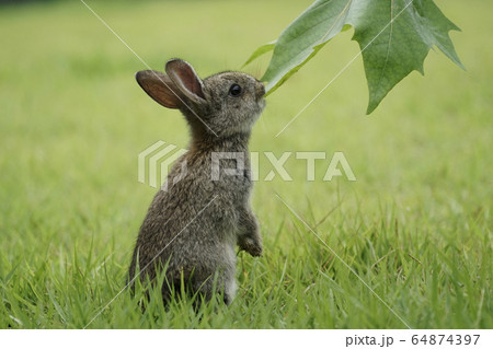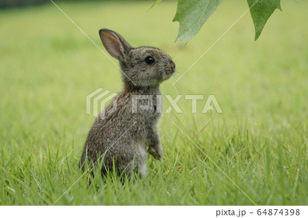 明るい草原の中に佇む可愛い野ウサギ