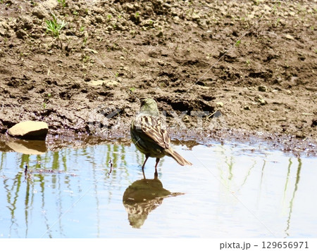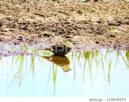 水たまりに水浴びに来たノジコ