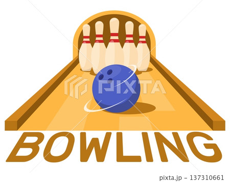 Bowling game. Ball rolling into row of standing pins. Fast spinning sphere. Skittles strike. Sport competition. Shot tournament. Competitive hobby. Challenge target. Club vector design