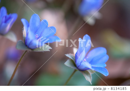 Blue Hepatica flowers in the spring forest. Closeup photo