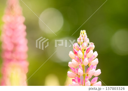Lupinus, lupin, lupine field with pink purple and blue flowers