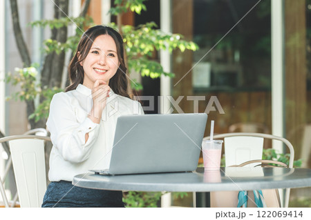 カフェのテラス席でノマドワークをするビジネスウーマン(ノマドワーカー)