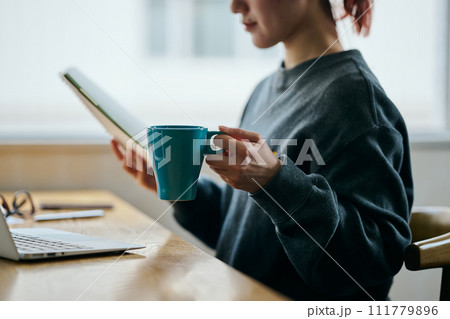 コーヒーカップを持ちながらノートを見る若い女性