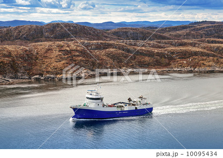 Blue Norwegian fish carrier ship passes through the fjord