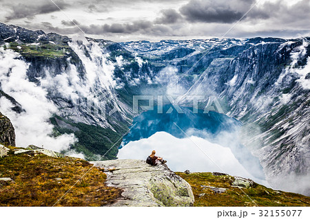 A boy sitting on the top of the mountain and enjoying Norway view above sea and mountains.