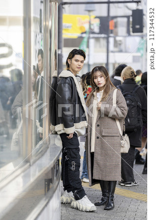街角に立つカメラ目線の若い男女
