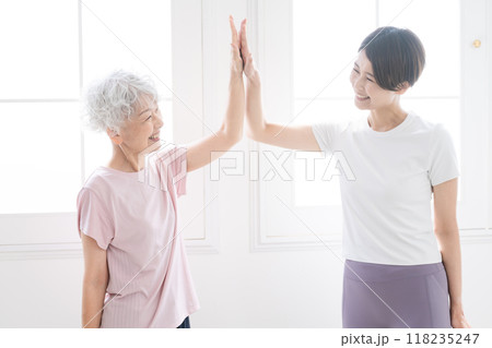 ヨガをする若い女性とシニア女性 健康イメージ