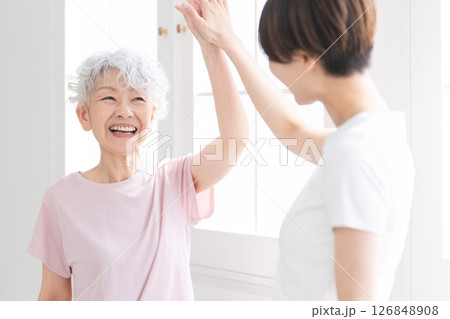 シニア女性とハイタッチ