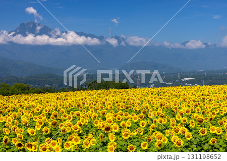 山梨県北杜市明野町浅尾 明野サンフラワーフェスの満開のひまわり畑と南アルプスの山々