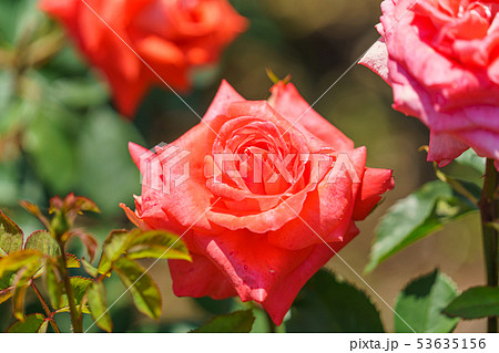 Varietal elite roses bloom in Rosengarten Volksgarten in Vienna. Pink Floribunda rose flowers