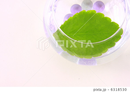 丸い花器に入れたビー玉とマザーリーフ(白背景)