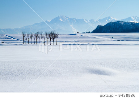新潟県小千谷市 田んぼに立つハサ木と越後三山の雪景色冬晴れの雪原