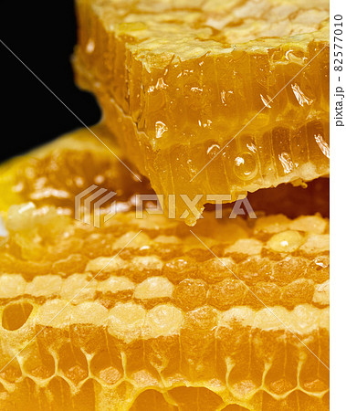 Glossy yellow golden honey comb reflection mirror sweet honey drips flow during harvest background with textspace