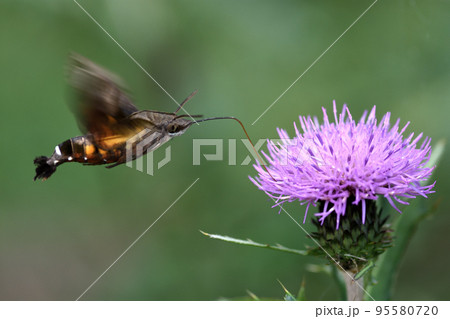 野原で咲くノアザミを訪れ、ホバリングしながら蜜を吸っているホシホウジャク